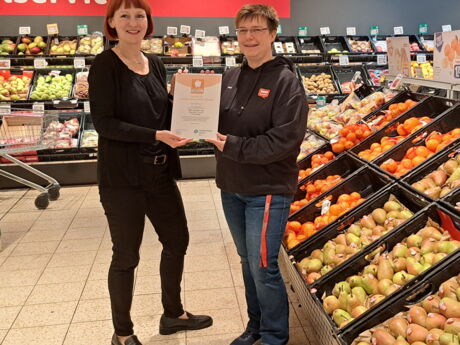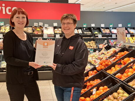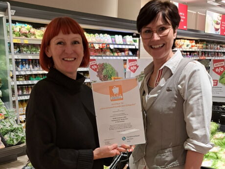 Im Bild v.l.n.r. Yvonne Redlich vom Handelsverband Sachsen e. V. und Steffi Lehmann von der REWE Wirker OHG, Geschäftsstelle Straße des 17. Juni.