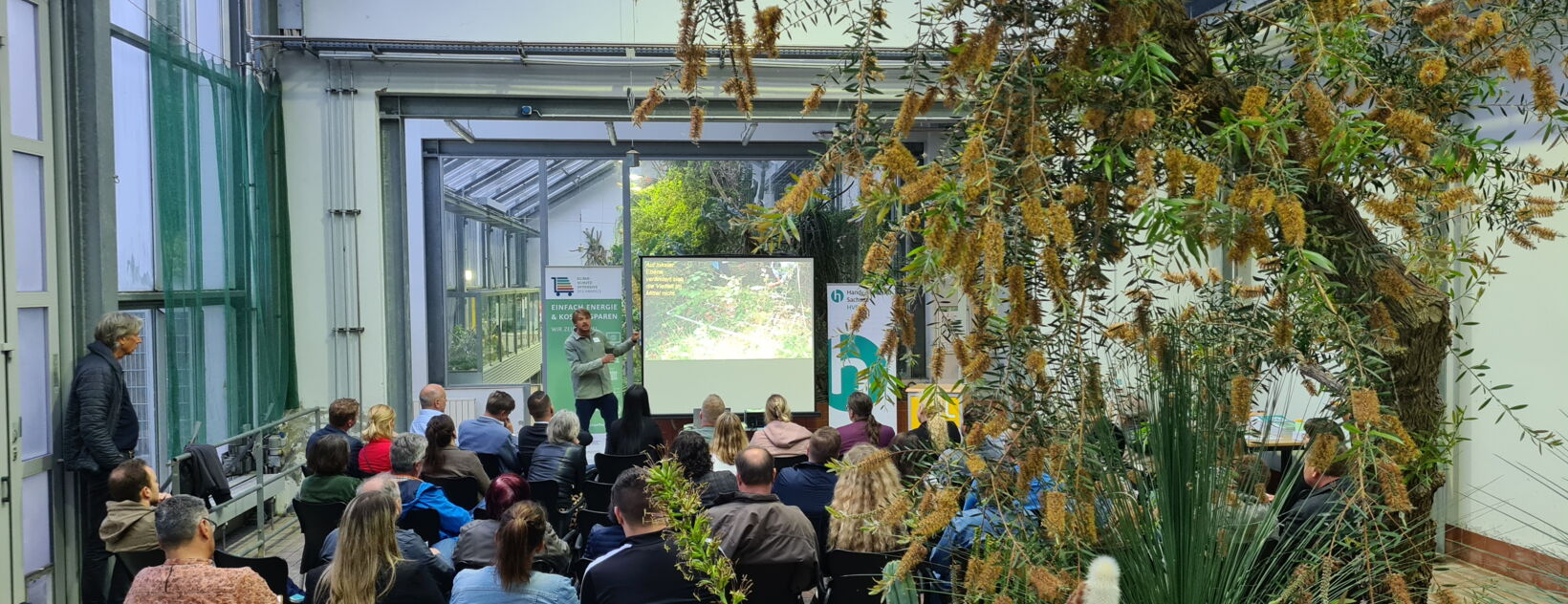 Mit Dr. Ingmar Staude, Referent auf der Veranstaltung vom Handelsverband Sachsen und der Klimaschutzoffensive des Handels im Botanischen Garten Leipzig sprach HVS-Geschäftsführer Gunter Engelmann-Merkel: