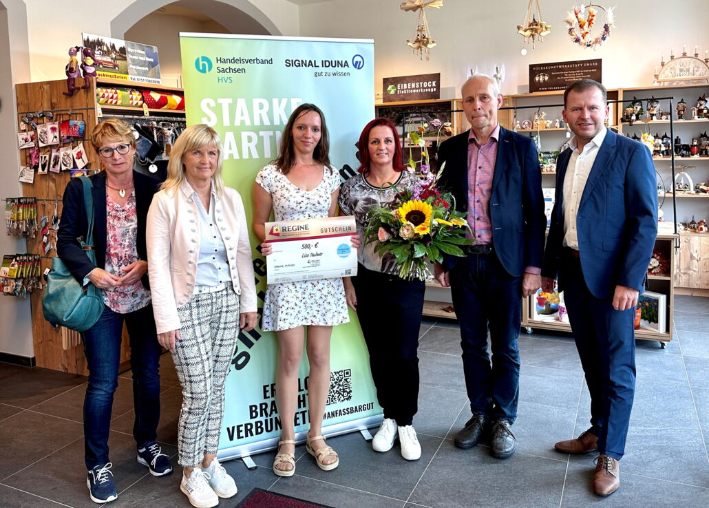 Am heutigen Dienstag (19. September 2023) überbrachten Bürgermeister Uwe Staab, der Hauptgeschäftsführer des Handelsverbandes Sachsen, René Glaser, und Handelsspezialistin Kerstin Bartlomeizik von der SIGNAL IDUNA ihre Glückwünsche an das Team von REGINE. Mit im Gepäck hatten sie nicht nur eine Urkunde, sondern auch einen Gutschein für ein individuelles Händlerportrait für eine 360°-Kampagne. Gleichzeitig wurde einer Kundin, die aus dem Kreis der vielen Teilnehmerinnen und Teilnehmern am parallelen Gewinnspiel ausgelost wurde, ein Einkaufsgutschein in Höhe von 500,00 Euro überreicht.