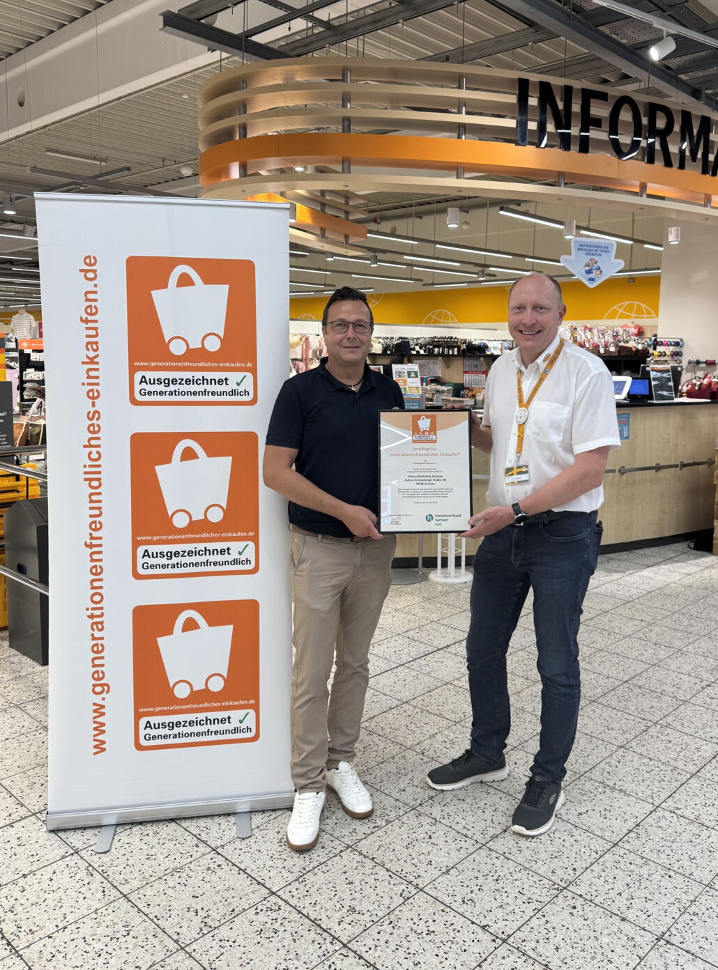 Die Globus Markthalle im Glück-Auf Center in Zwickau darf sich nach einem hervorragenden Ergebnis weiterhin mit dem leuchtend orangefarbenen Logo als "Ausgezeichnet Generationenfreundlich" präsentieren. Das durch den Handelsverband Sachsen ausgestellte Qualitätsiegel soll Menschen aller Altersgruppen, ganz gleich ob es um Eltern mit Kinderwagen, Menschen im Rollstuhl oder Senioren geht signalisieren, wo sie besonders komfortabel und vor allem möglichst barrierefrei einkaufen können. Mit großer Freude übernahm Hausleiter Heiko Weigert (rechts im Bild) die Urkunde von Jörg Vulturius vom Handelsverband Sachsen, die eine besondere Anerkennung für die hohe Qualität und Kundenfreundlichkeit eines Einzelhandelsunternehmens wiederspiegelt.