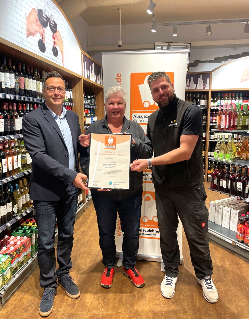 Voller Freude und Stolz nahmen Eric Schmidt und Ines Schmidt zum wiederholen Mal die Urkunde „Generationenfreundliches Einkaufen“ von Jörg Vulturius vom Handelsverband Sachsen entgegen.
