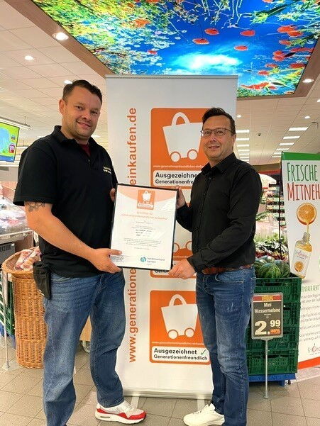 Direkt an der Bundesstraße in Geithain liegt der Edeka Markt von Kay Nagler. Mit großer Leidenschaft richtete der Kaufmann das Konzept seines Marktes konsequent darauf aus, eine angenehme Einkaufsatmosphäre zu schaffen. Unterstützt wird er dabei von einem hervorragenden Team, welches freundlich und kompetent auf jeden Kunden eingeht. Die Begleitung zur Ware ist hier selbstverständlich. Breite Gänge, ein ausgebauter Zugang zum Geschäft, angenehme Beleuchtung und dezente Hintergrundmusik umschmeicheln dabei das Herzstück des Marktes: die Obst- und Gemüseabteilung, wo man unter einem beleuchteten floralen Himmel frisches Obst und Gemüse finden kann. Herr Nagler (Links im Bild) nahm mit großer Freude von Jörg Vulturius vom Handelsverband Sachsen die Urkunde entgegen.