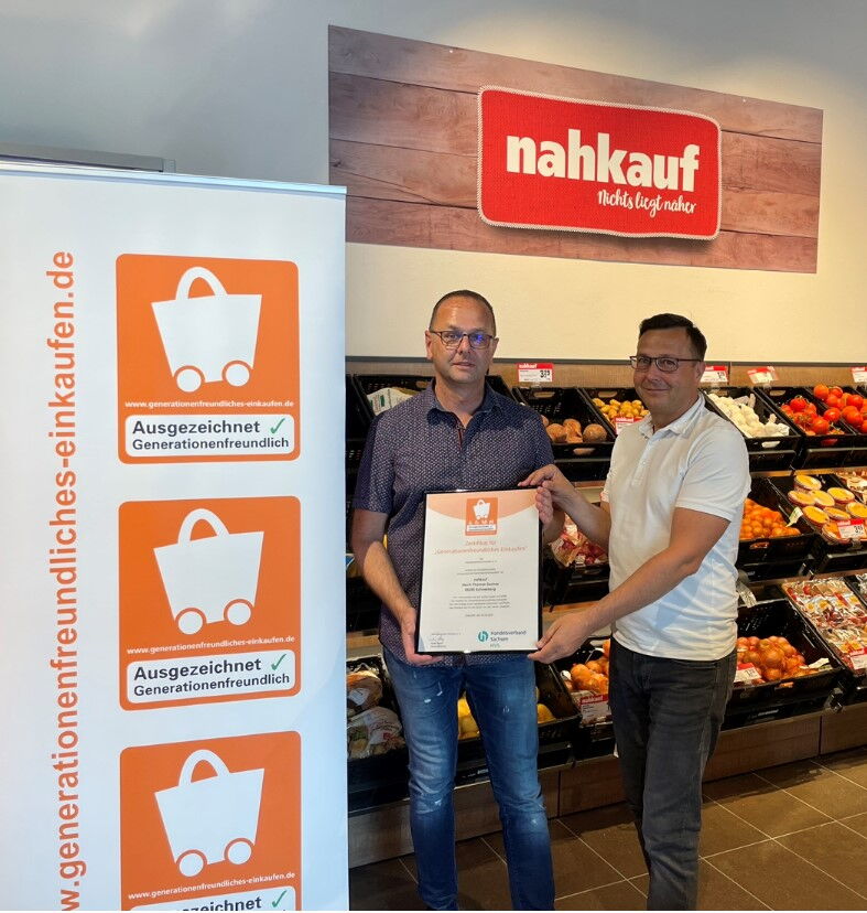 Im Nahkauf-Markt Schneeberg, an der Bruno-Dost-Str. 1a, können Kunden weiterhin komfortabel einkaufen. Nach eingehender Prüfung und unter Berücksichtigung der Bedürfnisse aller Kunden, wurde das Qualitätszeichen "Ausgezeichnet Generationenfreundlich" durch Jörg Vulturius vom Handelsverband Sachsen, an den Inhaber Thomas Sachse (links im Bild) übergeben. Der Handelsverband Sachsen gratuliert Herrn Sachse und seinem Team ganz herzlich zur wiederholten Auszeichnung.