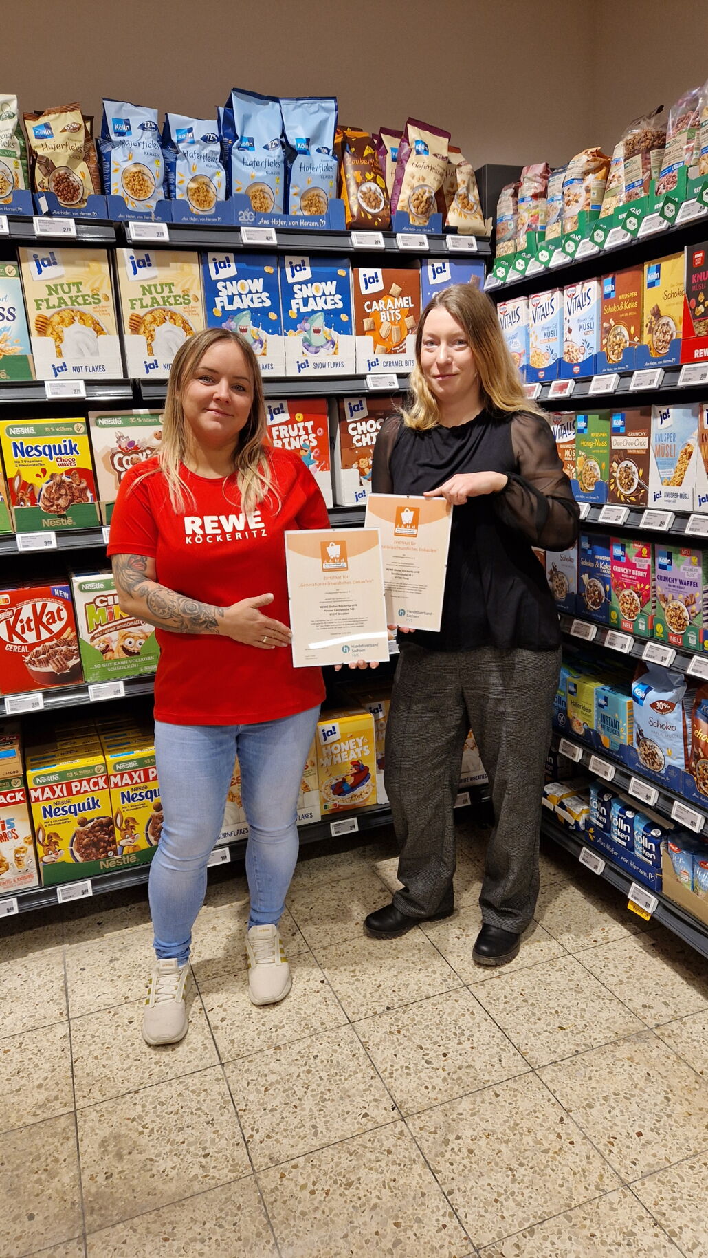 Die REWE Märkte von Stefan Köckeritz in Pirna und Dresden/Leuben können sich erneut über die Auszeichnung als generationenfreundlicher Supermarkt freuen. Beide Märkte überzeugen durch eine breite Angebotspalette und zuvorkommende Mitarbeiter. Auch sonst wird den Kunden einiges geboten, so gibt es im Leubener Markt eine Wursttreppe und eine "Extra Wurst" für die kleinen Kunden. In Planung ist weiterhin eine kostenfreie Grünfutterabholstelle für die felligen Mitbewohner. Stellvertretend für alle Mitarbeitenden der Rewe Märkte von Stefan Köckeritz, nahm Abteilungsleiterin Frau Wendrich die Urkunde entgegen.