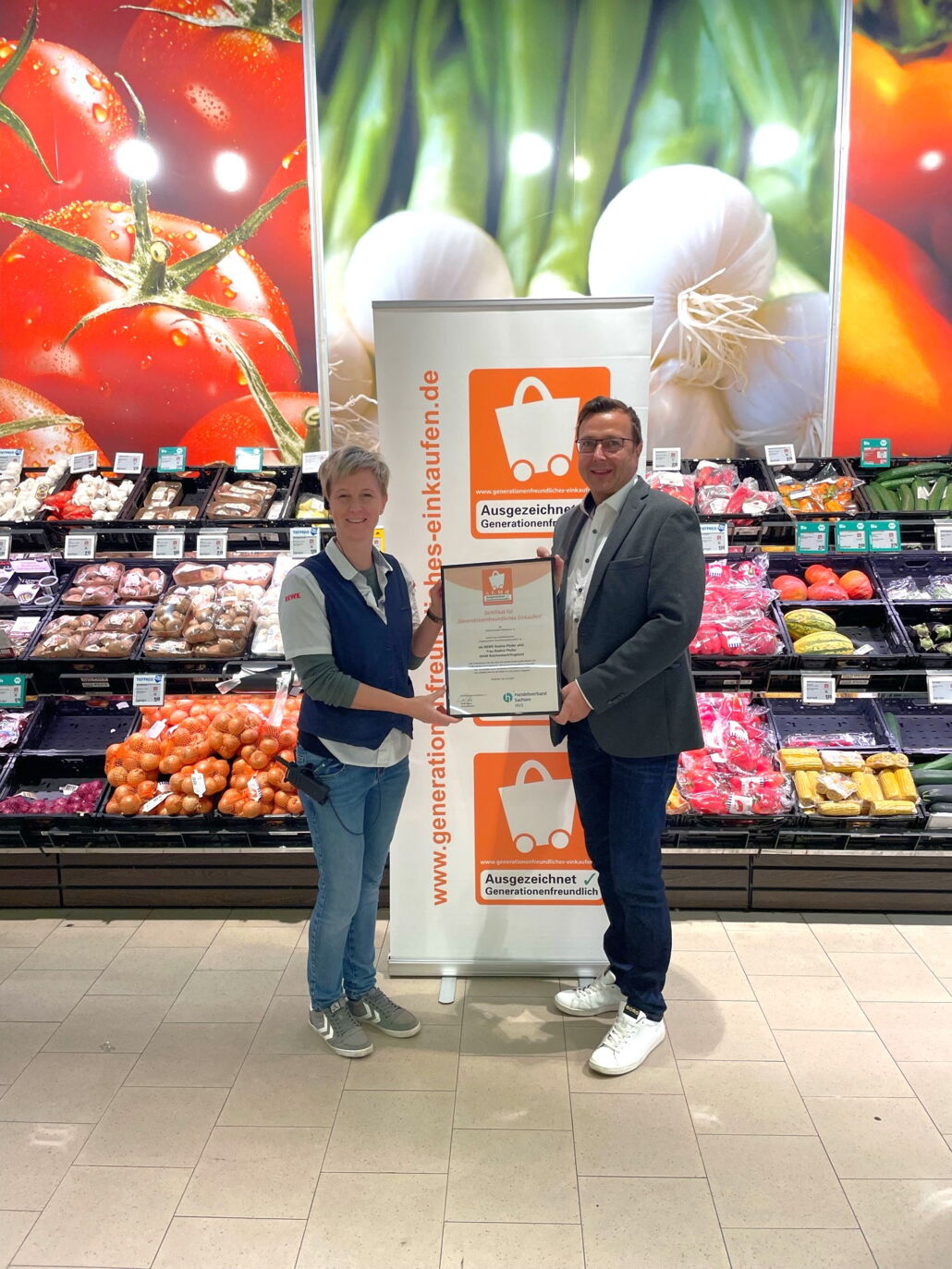 Frau Pfeifer und Ihr Team freuen sich über die erneute Auszeichnung mit dem „Qualitätszeichen Generationenfreundliches Einkaufen“. Die Urkunde wurde von Jörg Vulturius vom Handelsverband Sachsen überreicht.