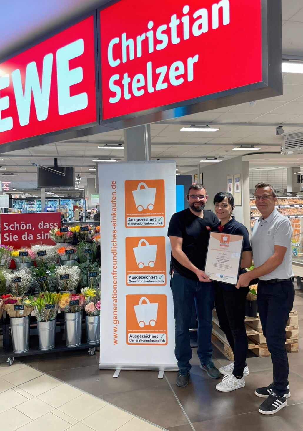 Der familiengeführte REWE Markt von Christian und Nicole Stelzer in Reichenbach durchlief bereits zum 5. Mal das Zertifizierungsverfahren zum „Qualitätszeichen Generationenfreundliches Einkaufen“ mit einer ausgezeichneten Quote. Familie Stelzer und das ganze REWE-Team arbeiten stets mit großer Leidenschaft, damit die Kunden in positiver Atmosphäre ihre Einkäufe erledigen können. Ebenso wird auf Nachhaltigkeit großer Wert gelegt und Obst, Gemüse, Fleisch oder Honig werden direkt aus der Region angeliefert.