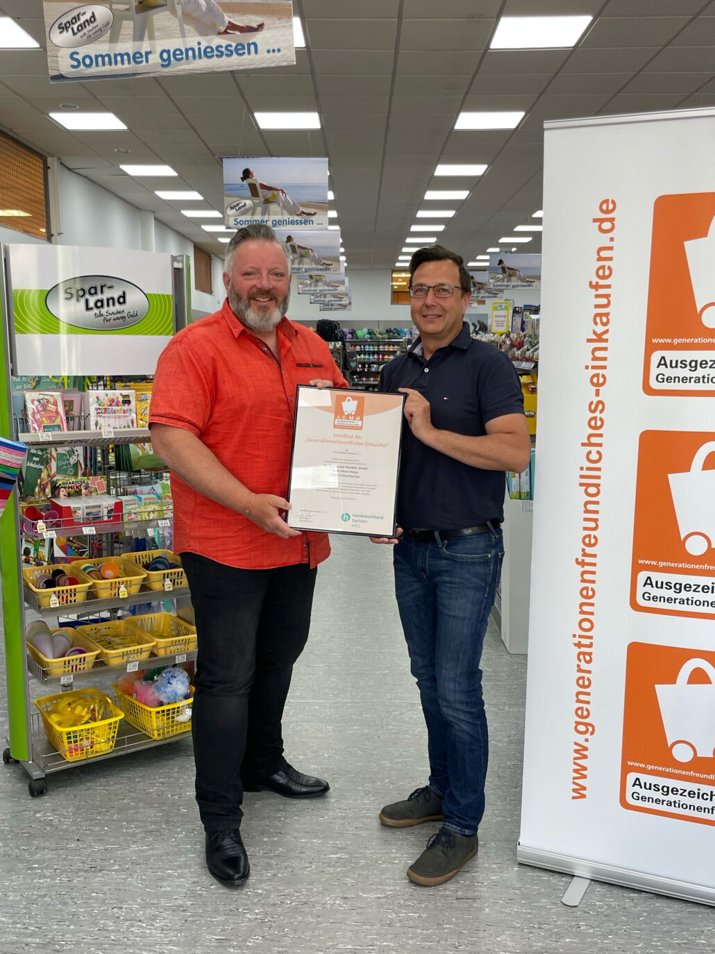 René Heber (l.im Bild), der Inhaber der Spar-Land Handels GmbH nimmt voller Stolz und großer Freude, die Auszeichnung für generationenfreundliches Einkaufen, durch Jörg Vulturius (r.im Bild) vom Handelsverband Sachsen entgegen.