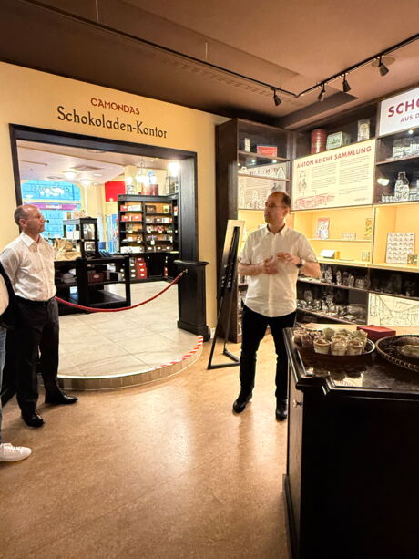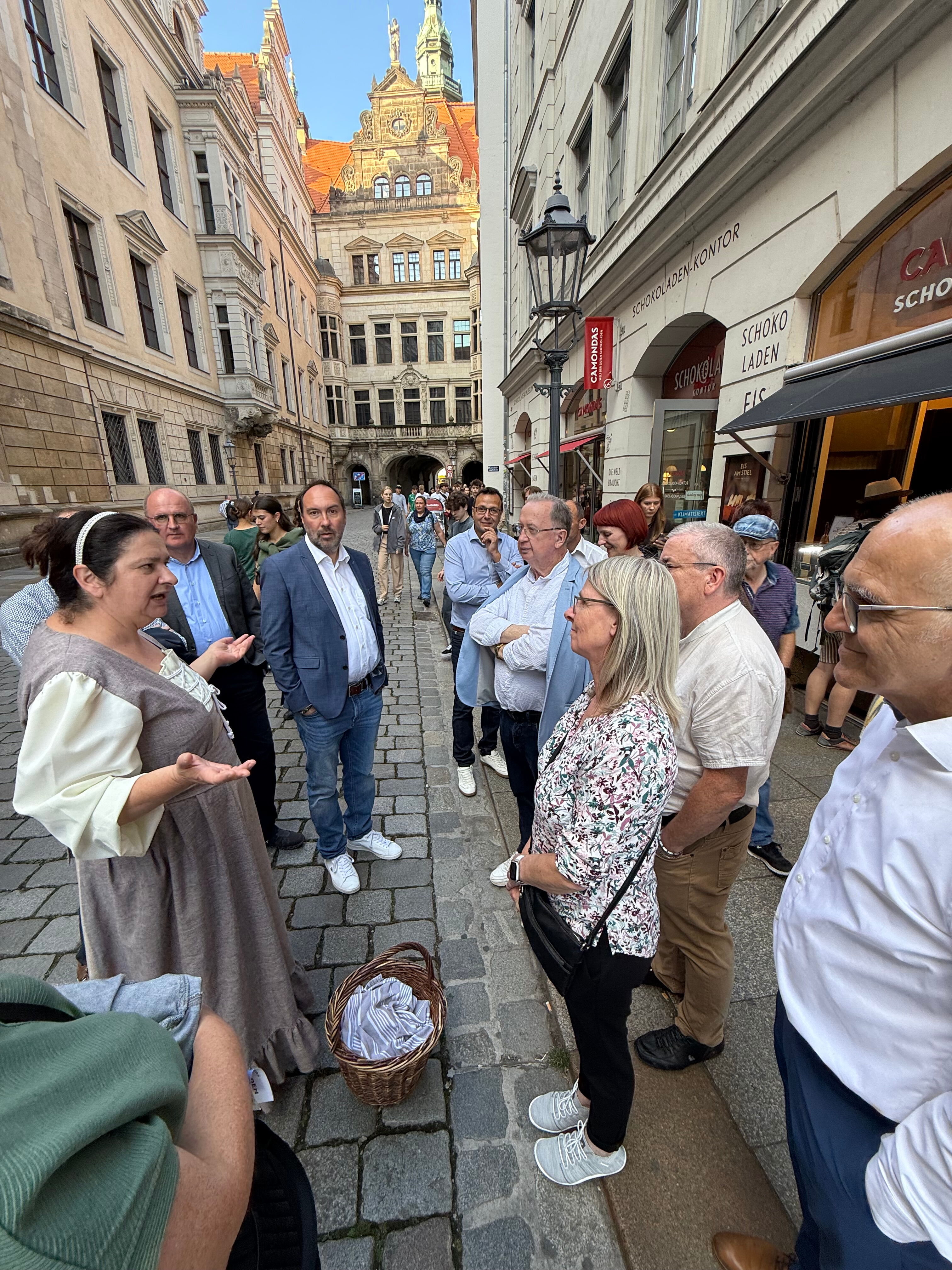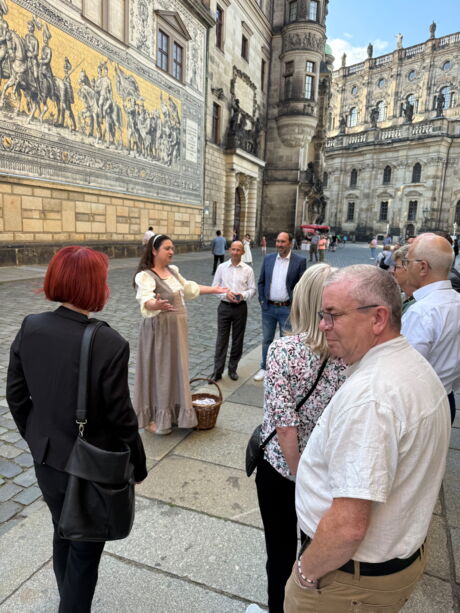 Am 08. September fand in Dresden das Mitteldeutsche Handelstreffen statt. Die Teilnehmenden erlebten einen inspirierenden Nachmittag und Abend in besonderer Atmosphäre – geprägt von spannenden Impulsen, kulinarischen Entdeckungen und vielfältigen Möglichkeiten zum persönlichen Austausch. Die Magd Mathilda führte die Teilnehmenden durch die Dresdener Altstadt und hatte manch kecken Spruch auf den Lippen. Unterwegs verköstigten die Teilnehmer typisch Dresdner Eierschecke im Pulverturm auf dem Neumarkt und erhielten allerlei süße Einblicke in die Welt der Schokolade durch Ivo Schaffer, Inhaber von Camondas.