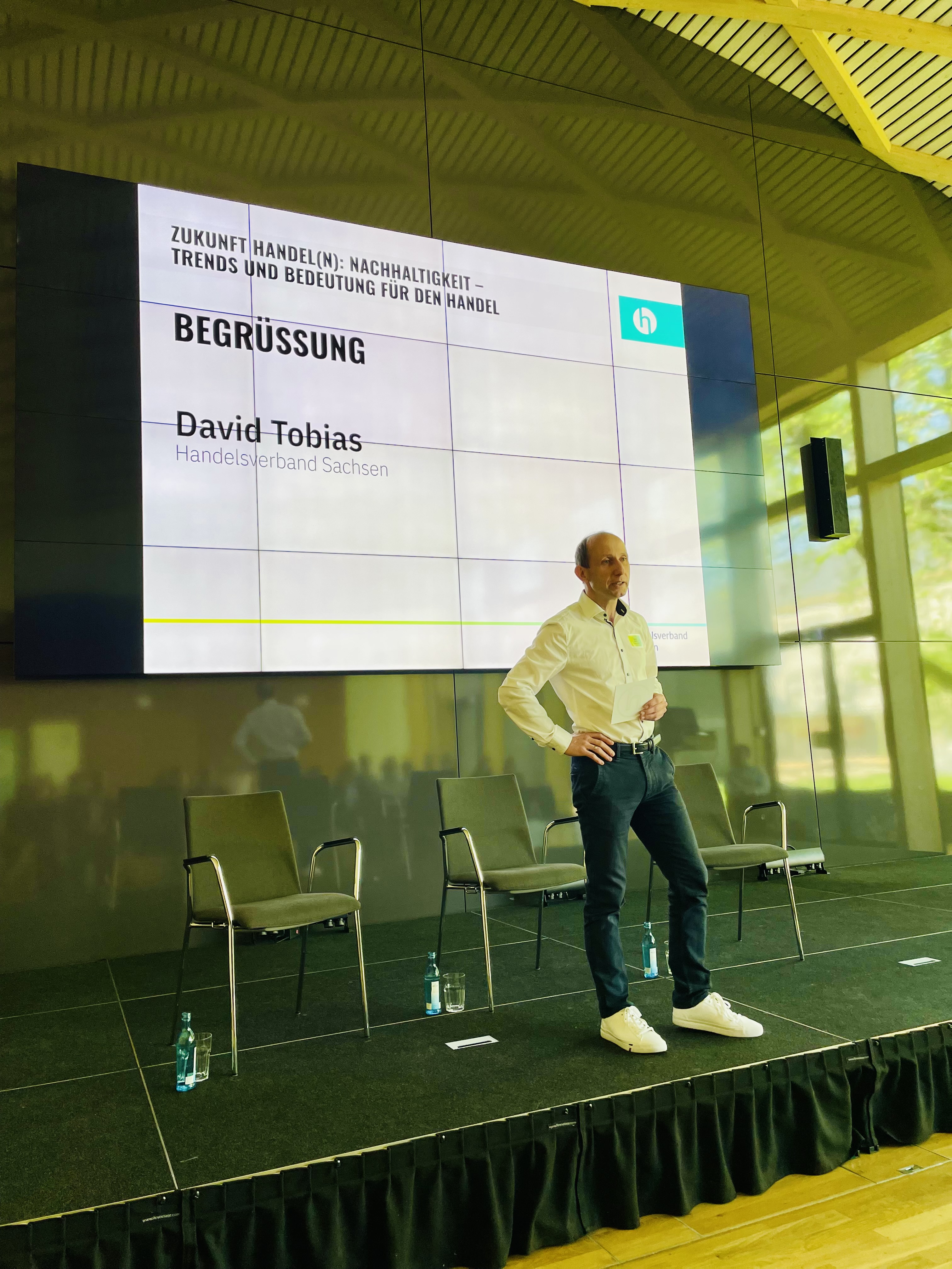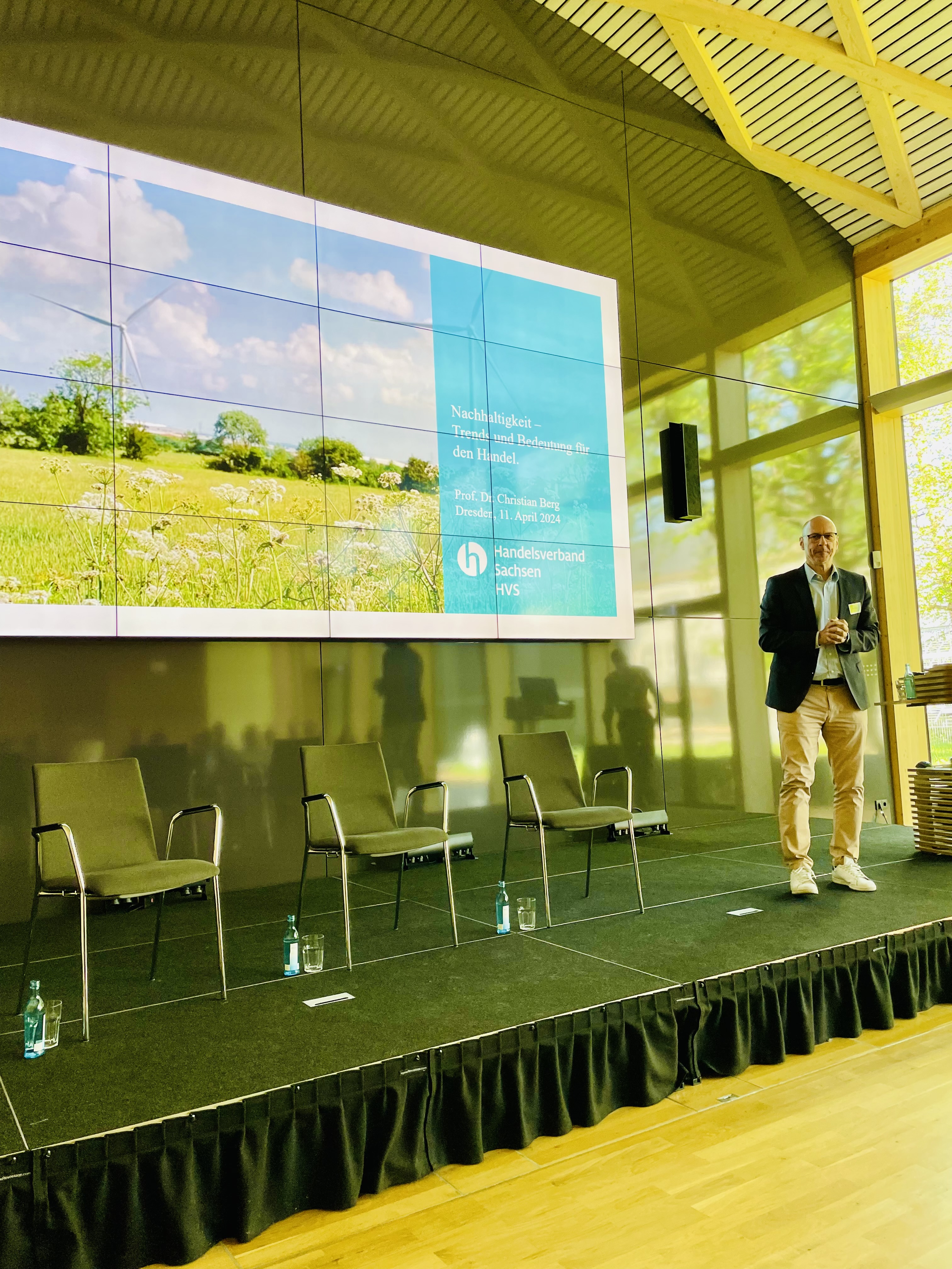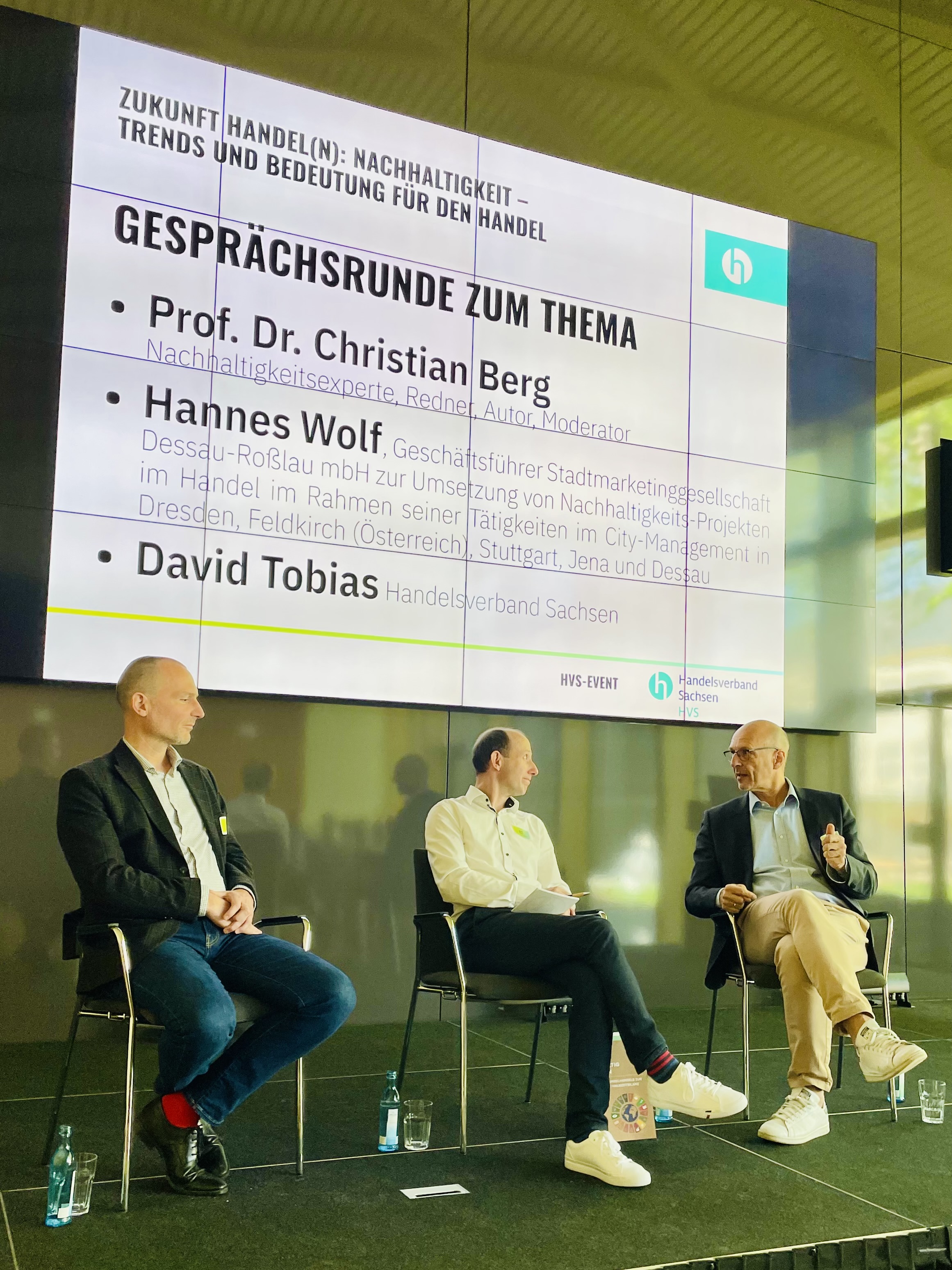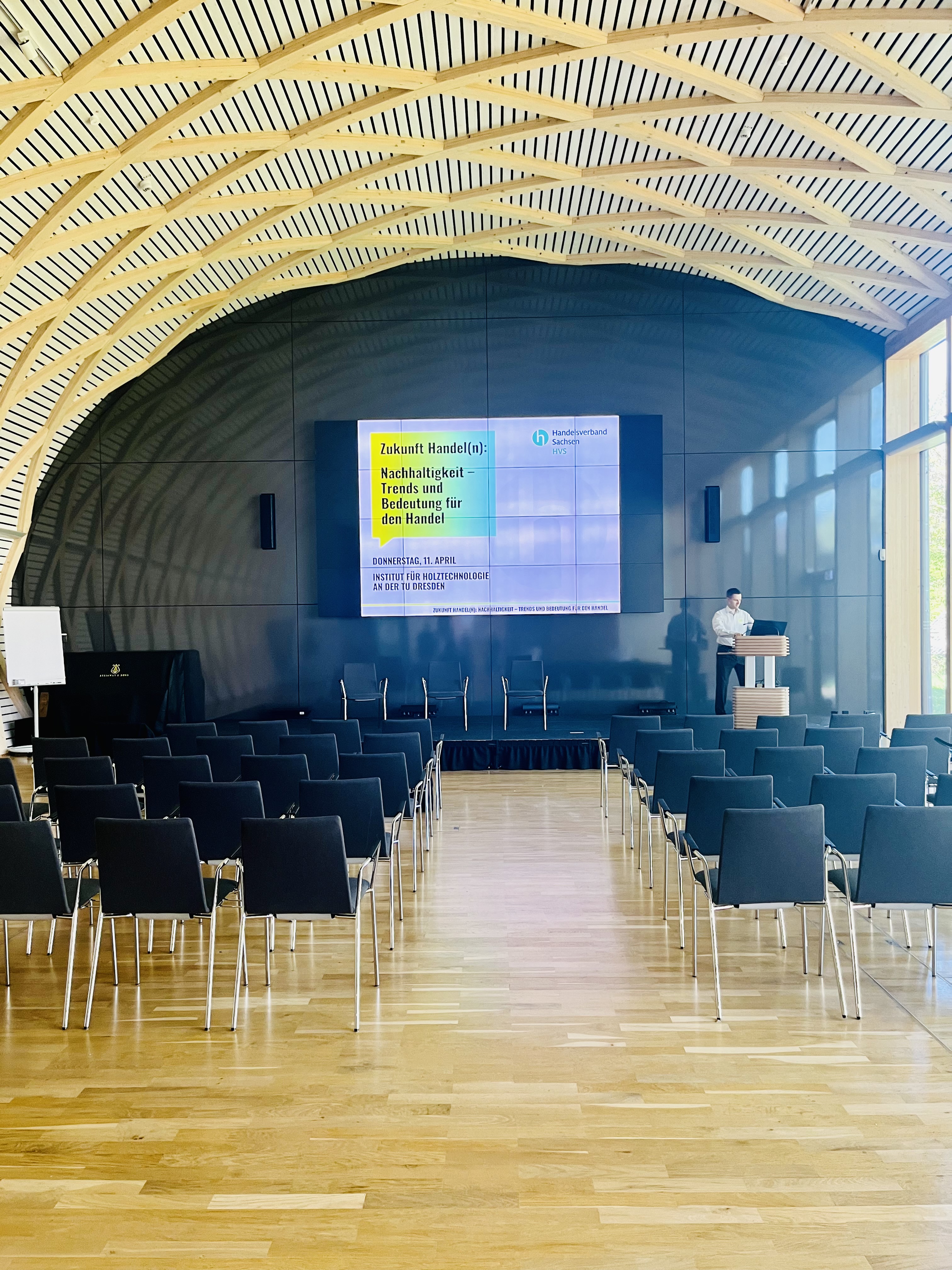 Zum Thema „Zukunft Handel(n): Nachhaltigkeit – Trends und Bedeutung" wurde am 11. April im Institut für Holztechnologie an der TU Dresden über die essentielle Rolle von Nachhaltigkeit im Handel mit Prof. Dr. Christian Berg gesprochen. Sein Vortrag beleuchtete aktuelle Trends und ihre Auswirkungen auf Unternehmen und Gesellschaft. Als Experte für nachhaltiges Wirtschaften eröffnete er neue Perspektiven für eine verantwortungsvolle Zukunftsgestaltung. In der anschließenden Diskussionsrunde sprach David Tobias vom Handelsverband Sachsen weiterhin mit Hannes Wolf, Geschäftsführer der Stadtmarketinggesellschaft Dessau-Roßlau, über die Bedeutung nachhaltigen Handelns in städtischen Gemeinschaften und über dessen langjährige Erfahrung im Citymanagement in Dresden, Feldkirch (AT), Jena, Stuttgart sowie Dessau.