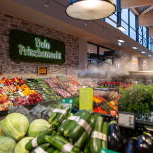 Der moderne Markt überzeugt durch ein großzügiges, helles Ambiente und ein vielfältiges Sortiment, das keine Wünsche offenlässt. Und oft begeistern die kleinen und liebevollen Details: zum Beispiel wurde die Weinabteilung durch die Düsseldorfer Künstler Martina & Thomas Klefisch gestaltet. Hier haben die Kundinnen und Kunden nun einen modernen, gut sortierten Markt direkt vor der Haustür – perfekt für den täglichen Bedarf sowie für saisonale Einkäufe.